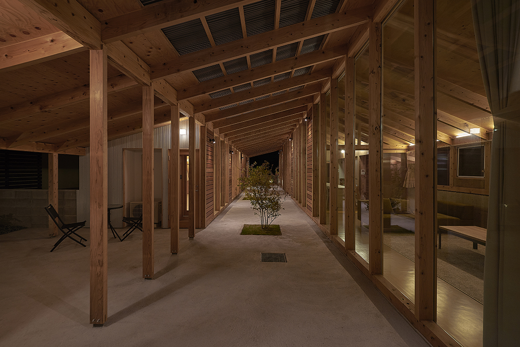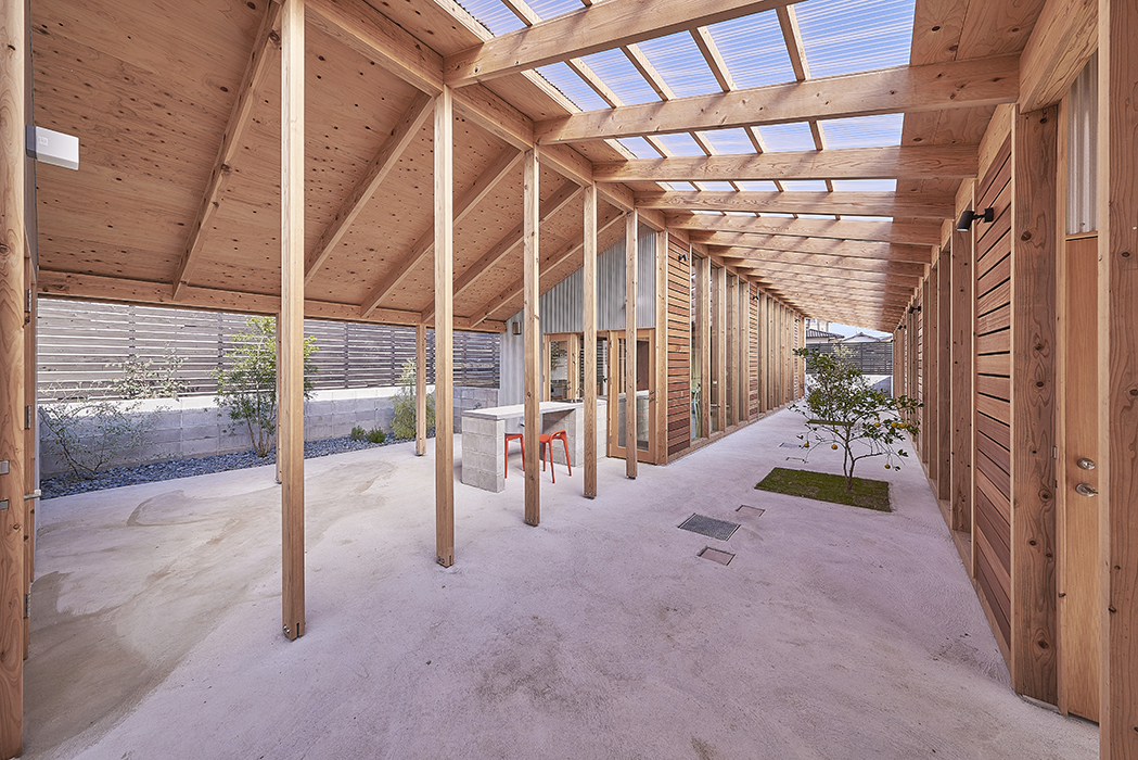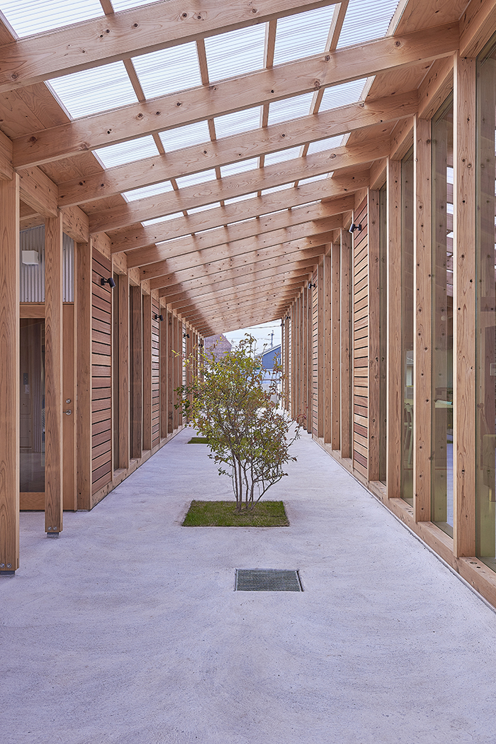 道路面からの高低差を活かして、建物を埋めることで地面と建物に包まるような空間をつくるとともに、