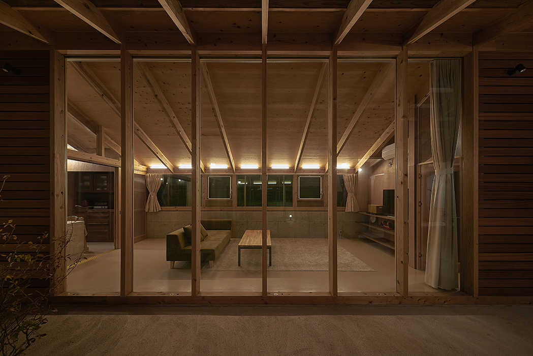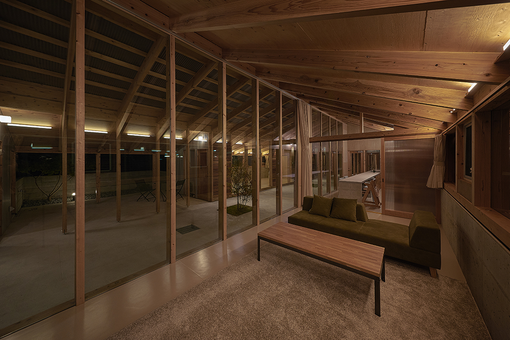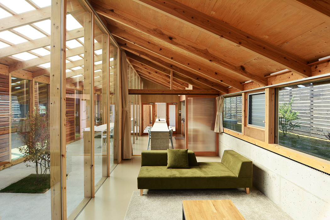 この家は中心から四方へ開放された中庭に各室を開くことで、外部を取り込みながら全体的に一つの空間を共有する。