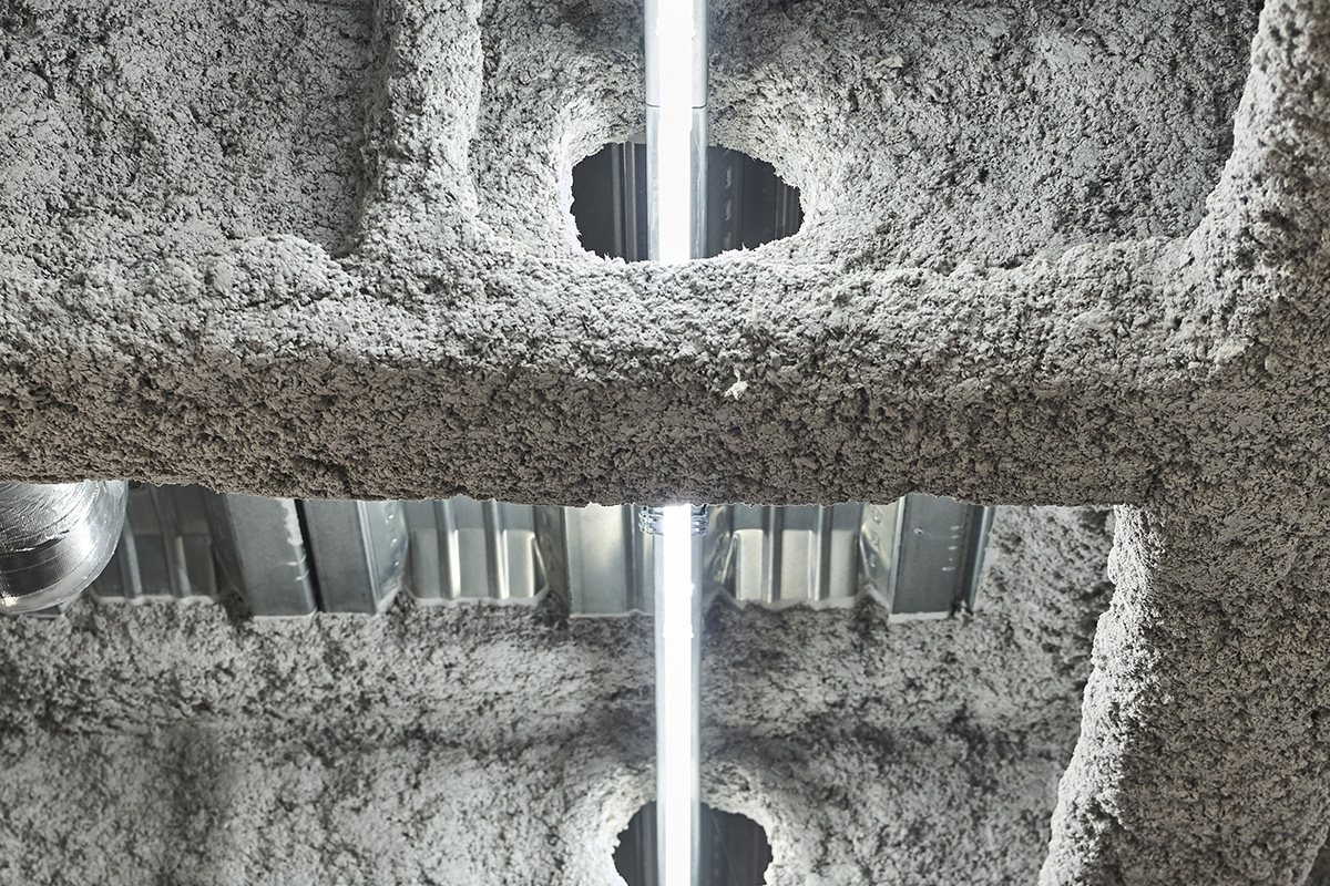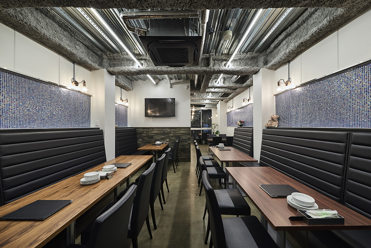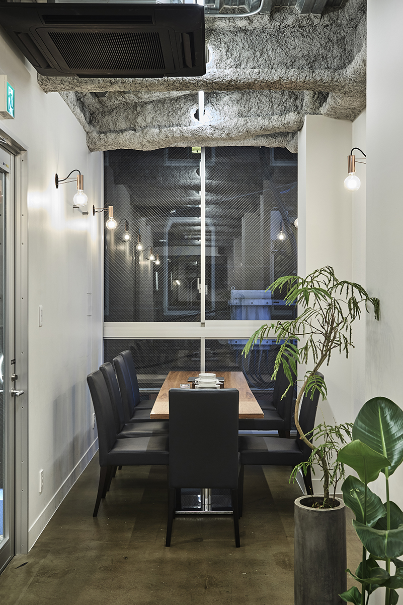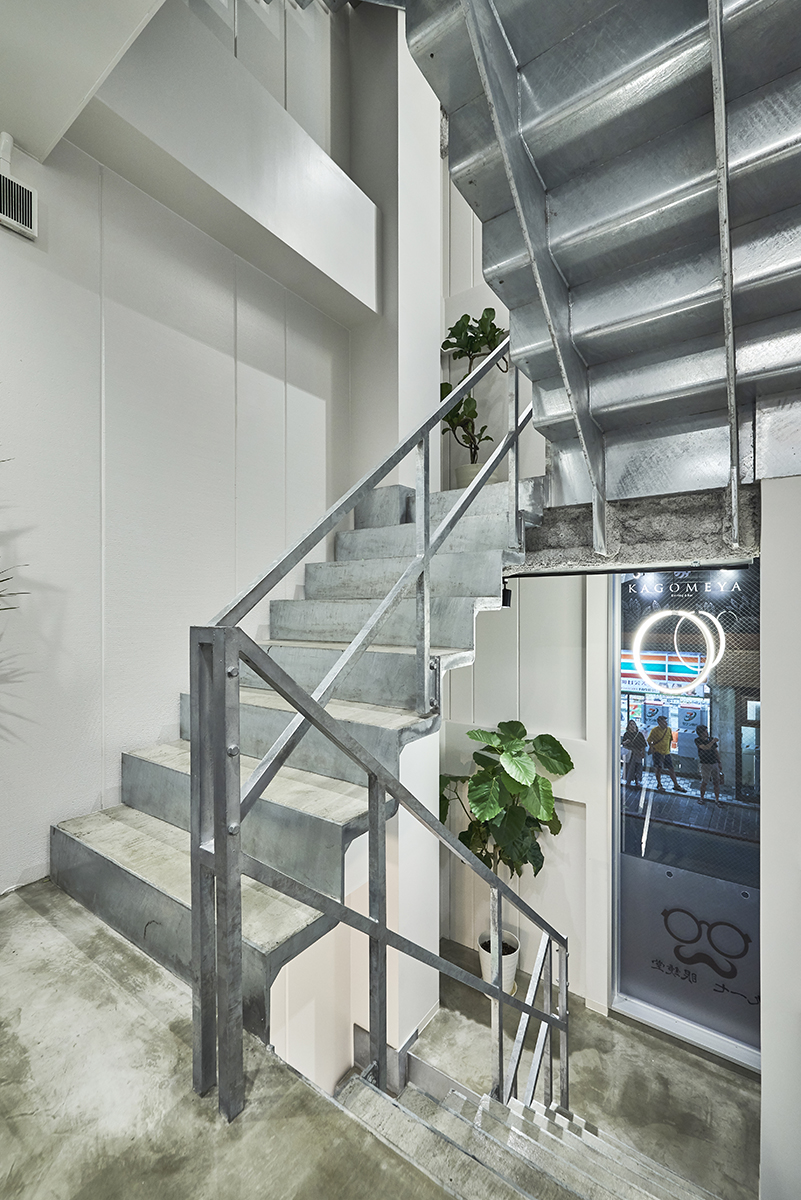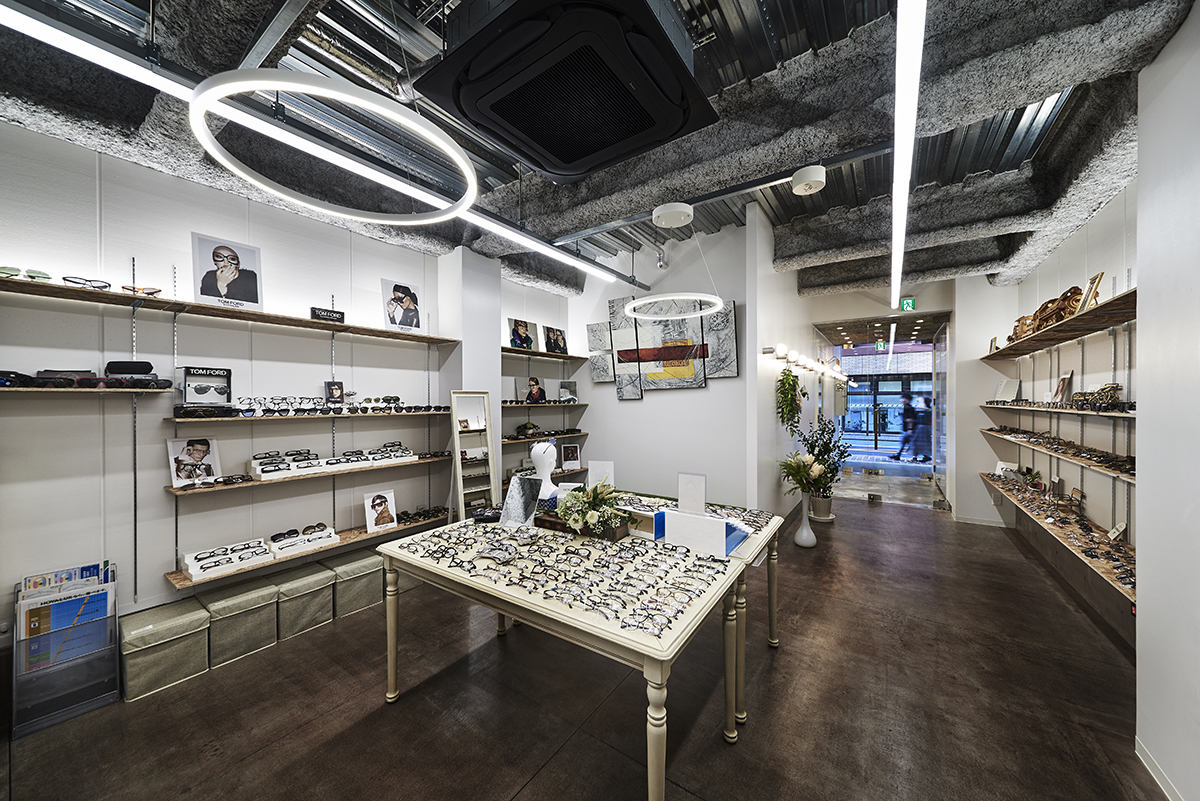 1階が眼鏡屋、2~4階がイタリアンレストランとなる。店舗において建築的な内装づくりをするため、構造と設備があらかじめ計画に織り込まれた形となるようにしたいと考えた。梁に一本貫かれた照明は、建築の構造であるとともに、インテリアであり、通りかかる人のアイストップとなることを期待している。