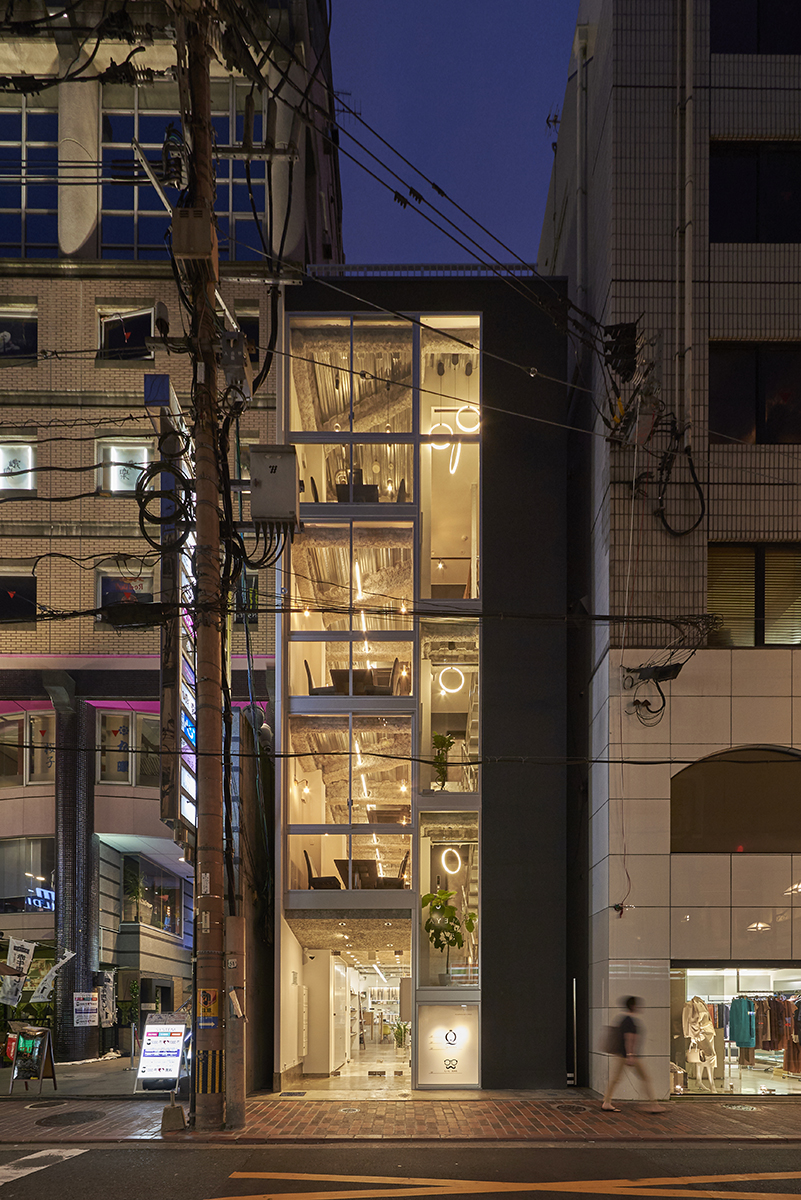 熊本市の繁華街に建つ商業ビルである。周辺はビルが立ち並ぶ場所の中で間口3間ほどの細長い形状の敷地が本プロジェクトの建設地である。