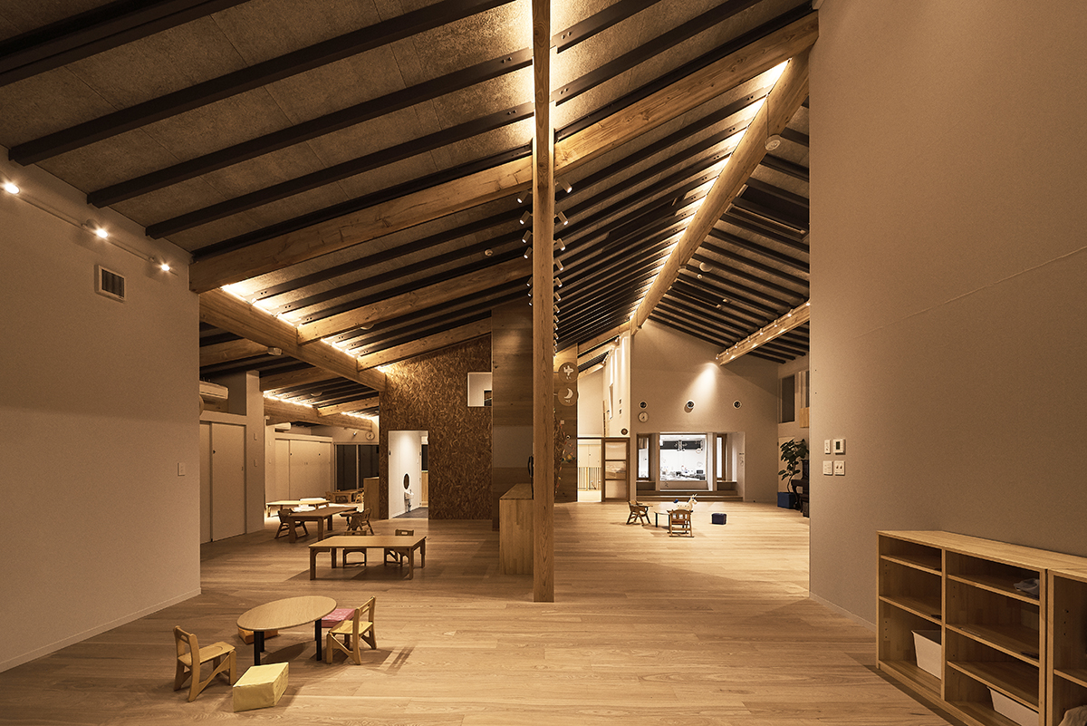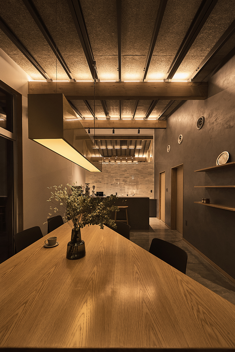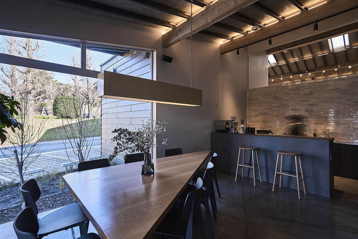 各部屋を仕切る扉は極力設けず、状況に応じて家具によってフレキシブルに分割できるようにしている。切妻型で南北におおらかに伸びる構造フレームを現した天井に対して少し入り組んだ平面が組み合わさることで、連続した一つながりの空間でありながら様々な風景を作り出す飽きの来ない時間を過ごせる場所にしたいと考えた。