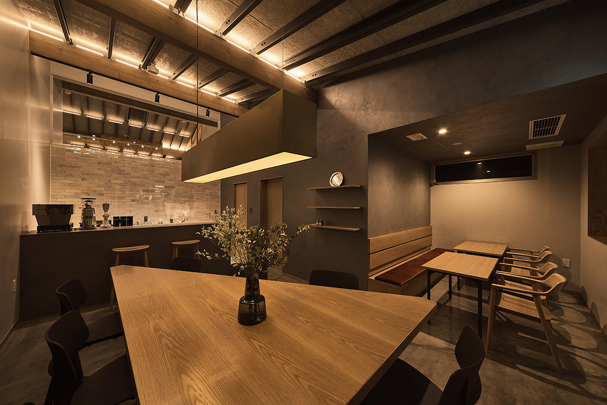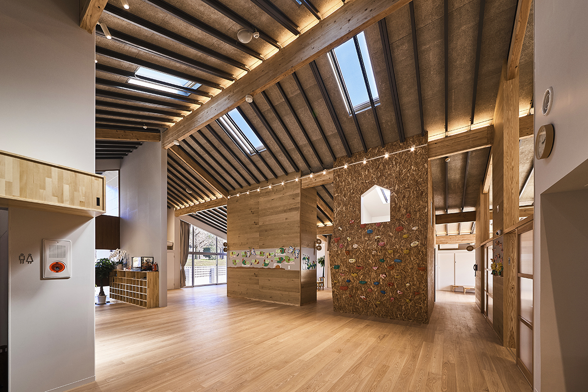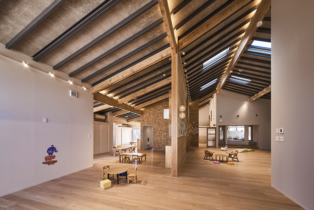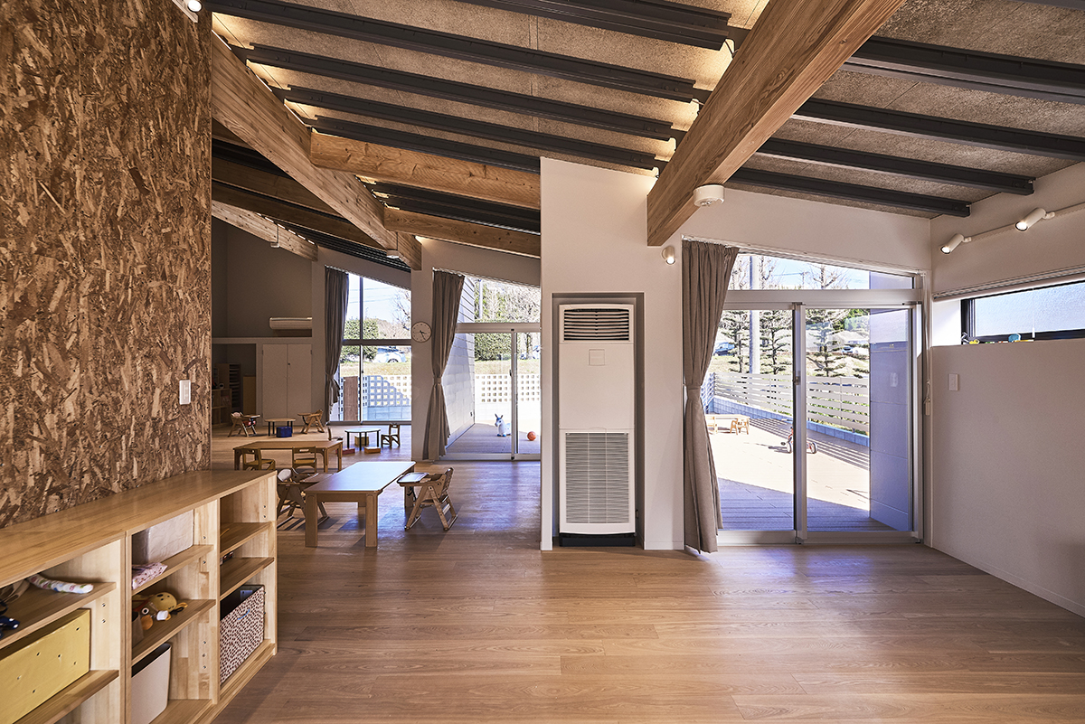 各部屋を仕切る扉は極力設けず、状況に応じて家具によってフレキシブルに分割できるようにしている。切妻型で南北におおらかに伸びる構造フレームを現した天井に対して少し入り組んだ平面が組み合わさることで、連続した一つながりの空間でありながら様々な風景を作り出す飽きの来ない時間を過ごせる場所にしたいと考えた。