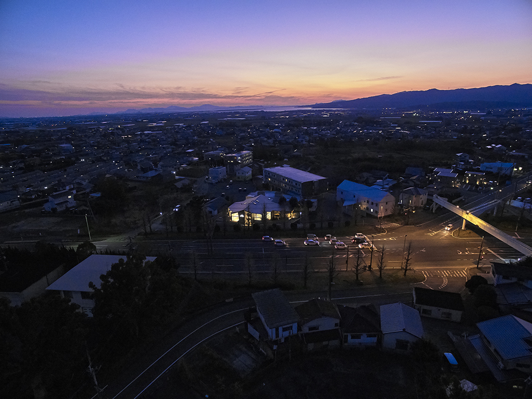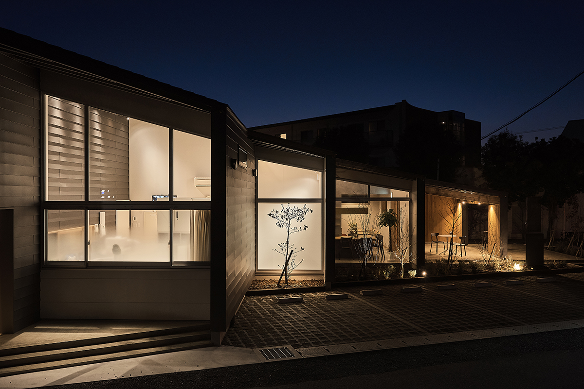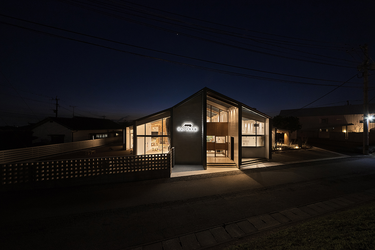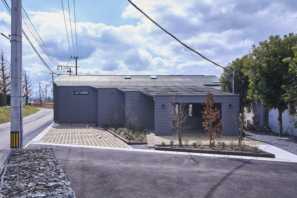 大きく緩やかに勾配の変化する大屋根の下、各室の配置を雁行させホールを中心に部屋同士が一つながりになる平面構成とした。