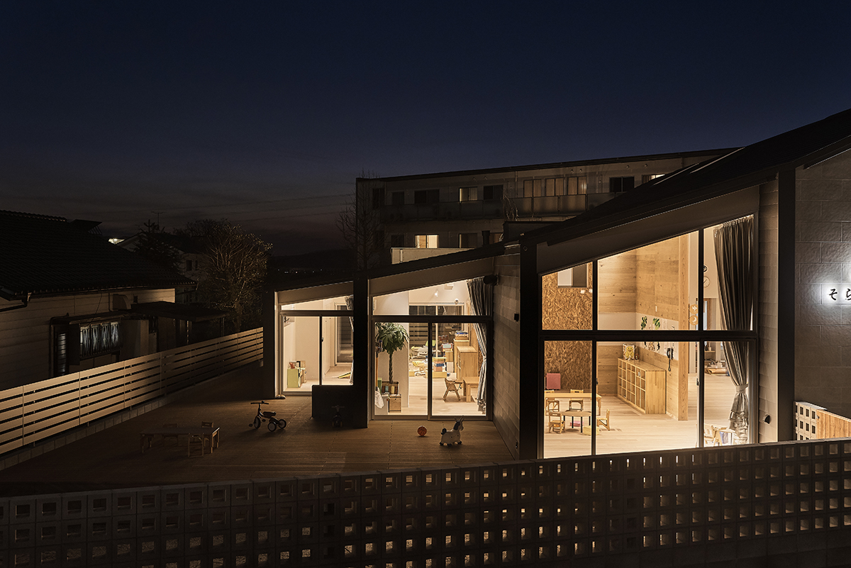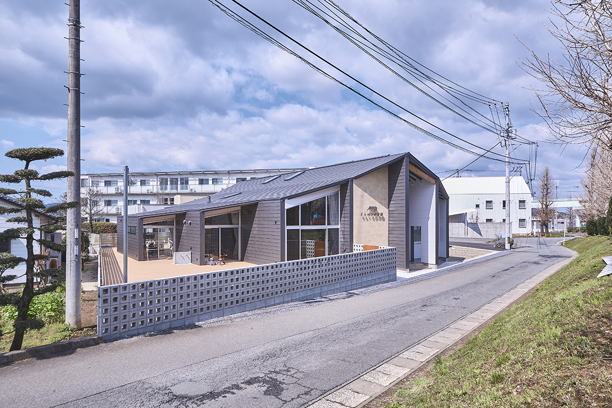 敷地は国道の側道に面した台形が変形したような形をしている。子供が駆け回る「大きな木の下」のようなおおらかに包まれた空間を作りたいと考えた。
