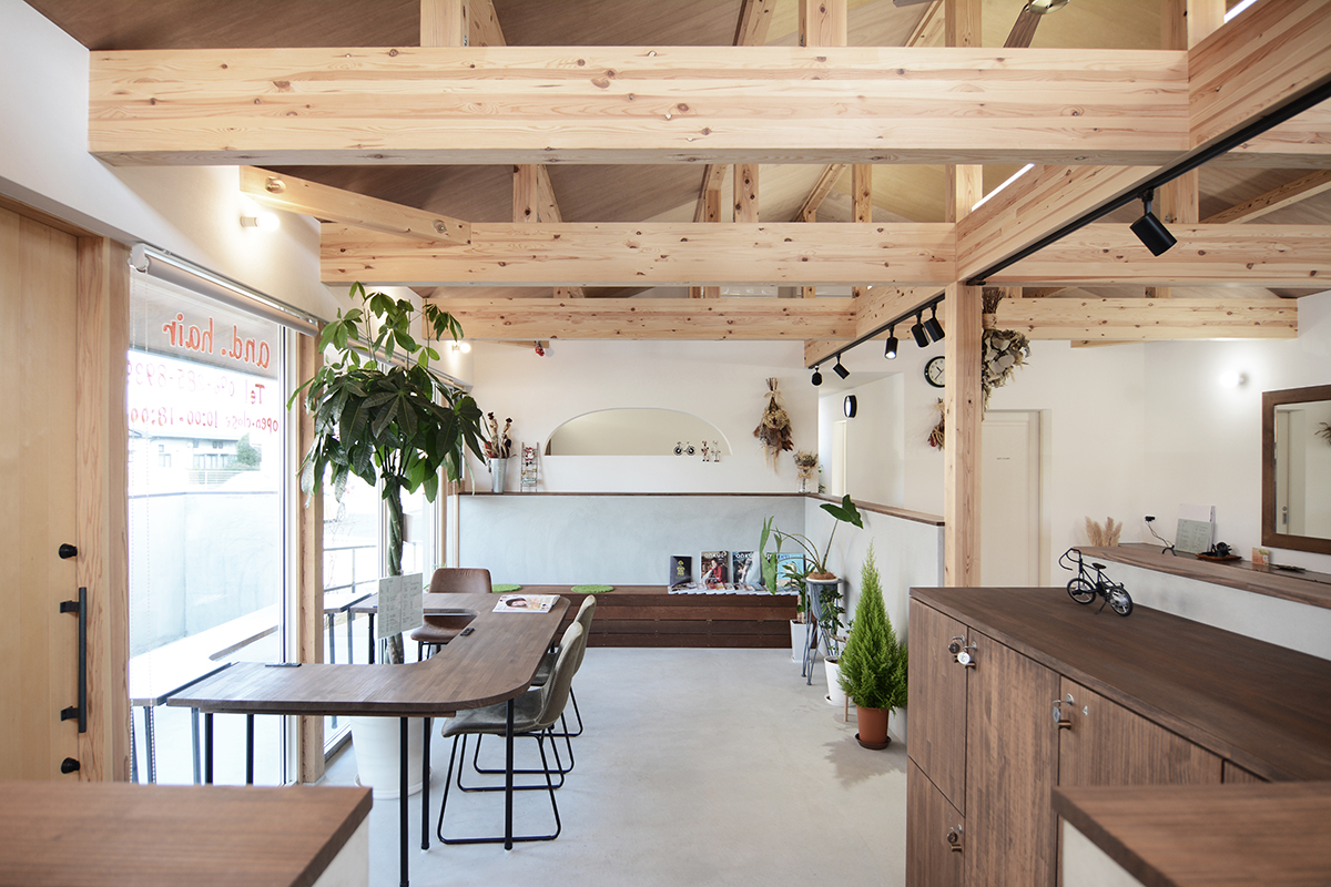 カットスペース・待合・外部(軒下)が緩やかなワンルームとなり常に顔の見える関係となるようにしました。和小屋組みで構造の骨格を作ることで素朴で家庭的な雰囲気をもつ内部空間です。
