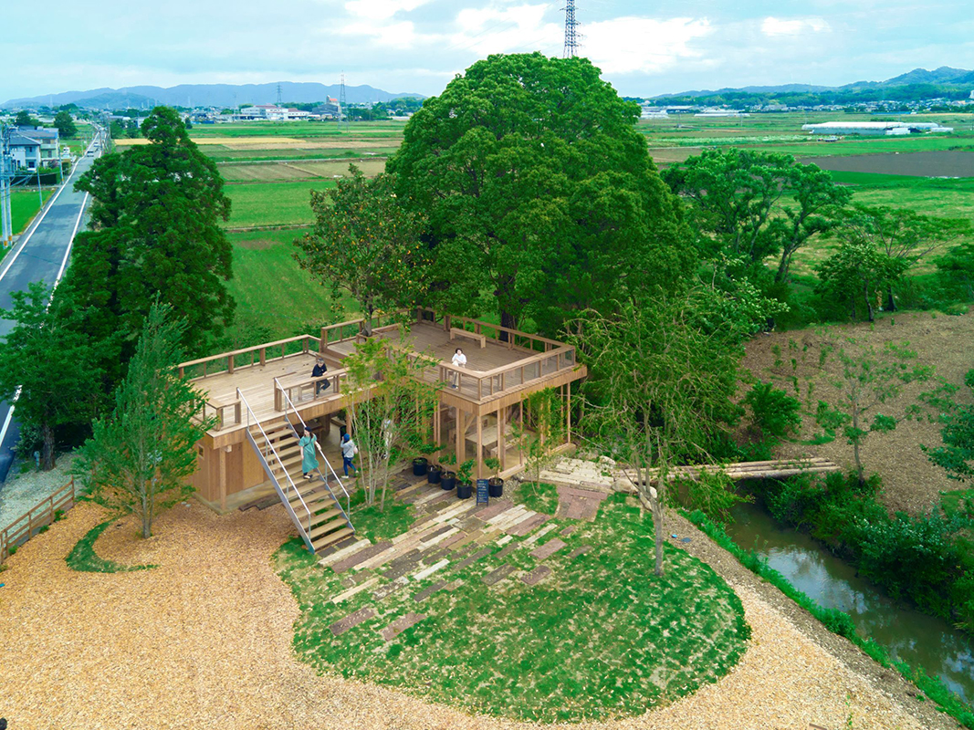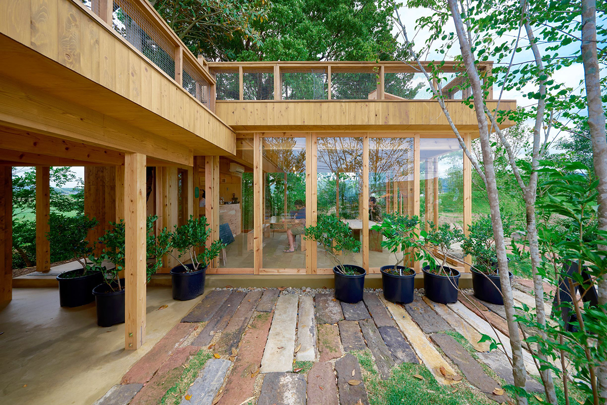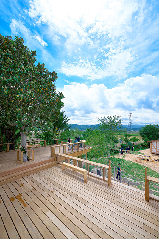 A tree house in "PLAY FARM" that combines a children's playground and a farm. Children can play freely in this farm. The tree house is a resting place and a high pedestal for watching over children. I didn't cut any trees. I wanted to be close to the environment that originally existed. Trees make a green roof. And it creates a pleasant shade.