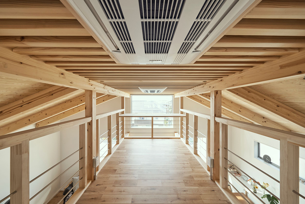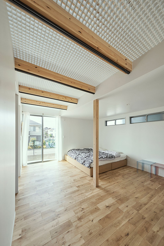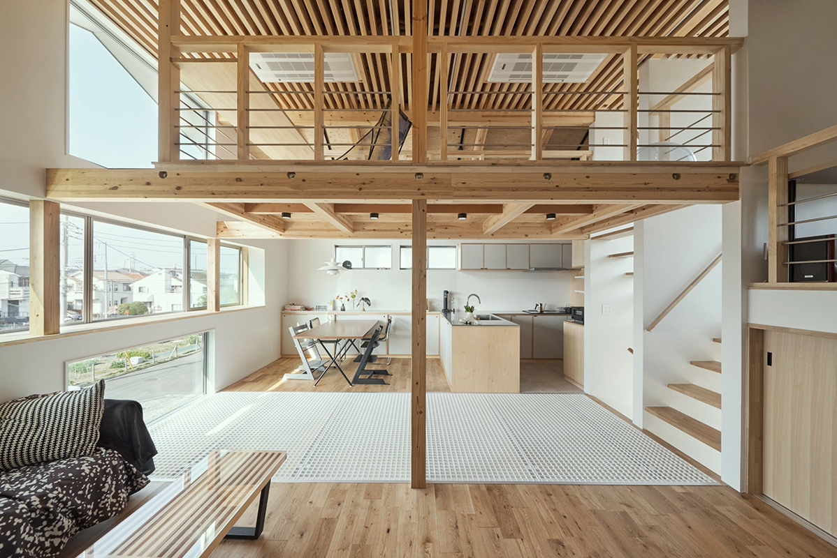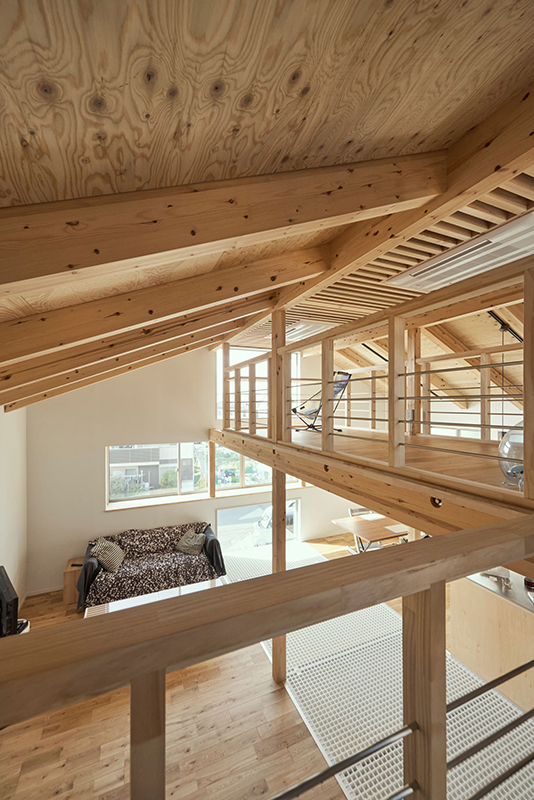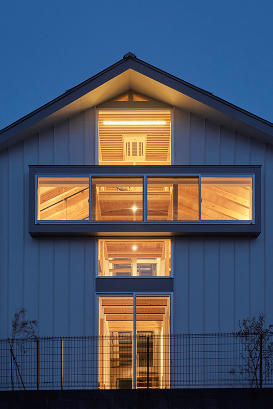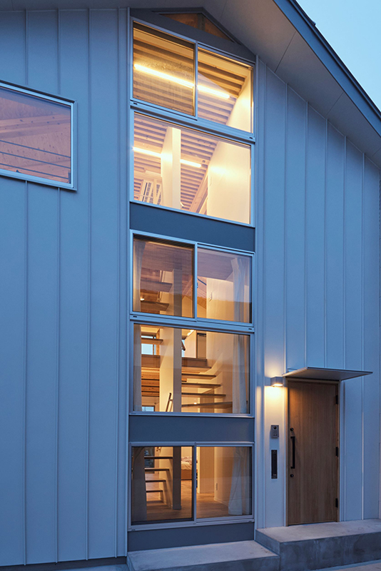 内部は吹抜けを介してワンルームとなっており、大きなヨコ窓とタテ窓があります。