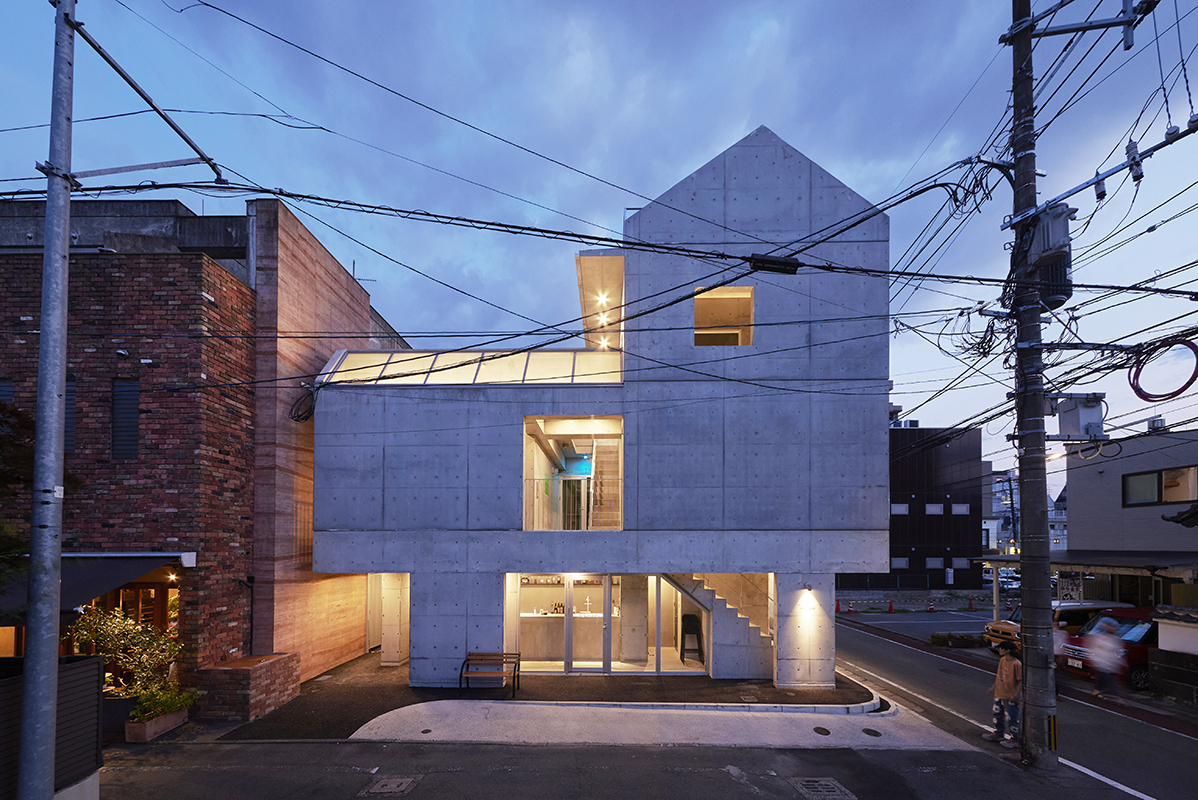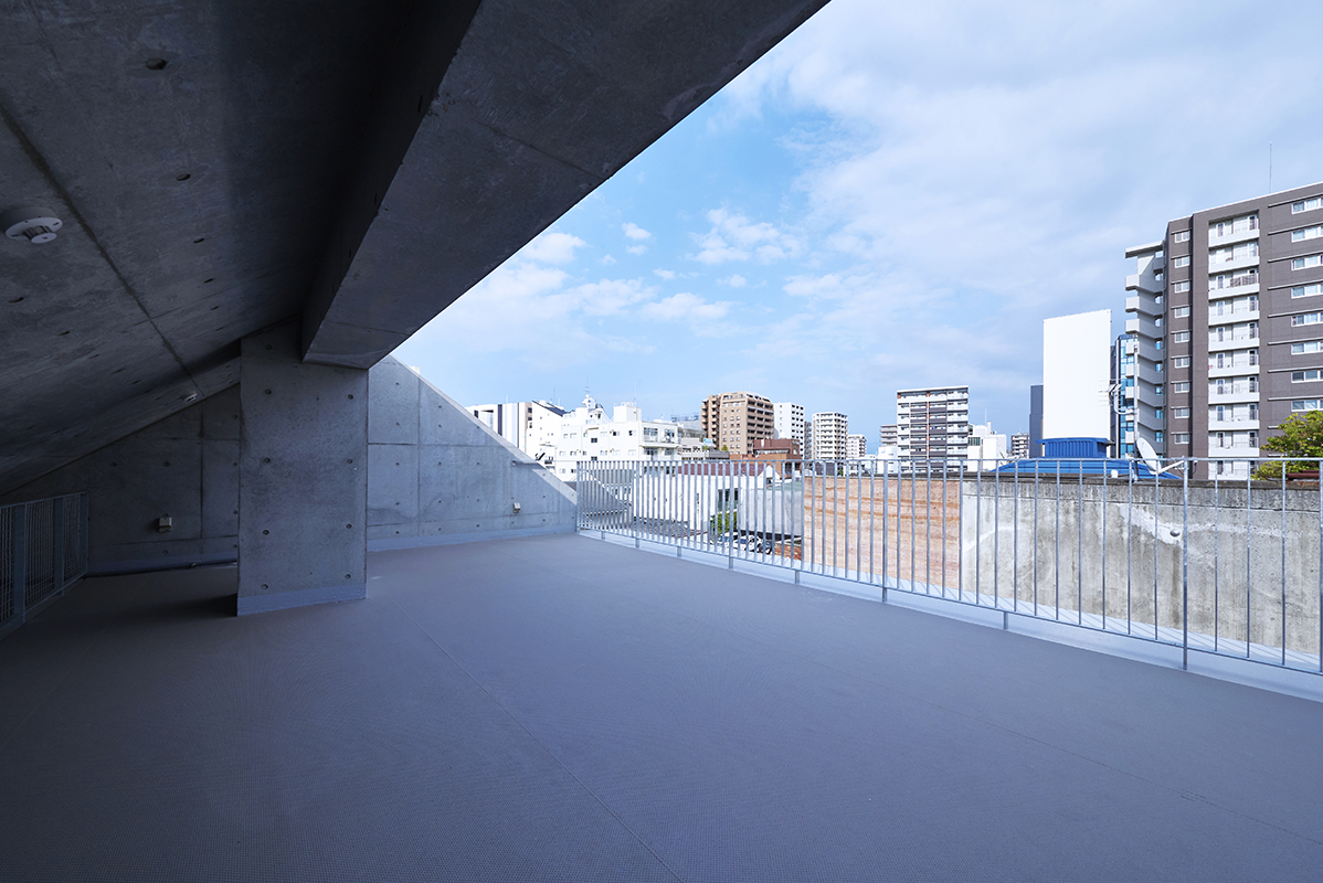 We designed a three-story tenant building on Kaminoura Street, which is the center of Kumamoto City. Kaminoura Street prospered by utilizing old low-rise wooden buildings. I followed the scale and image of Kaminoura Street. The "street" continues to the upper floors of the building. It's like a three-dimensional alley. All the shops aimed at a building like a roadside shop. On the first floor, we created a space like an eaves where everything around the building faces the alley.