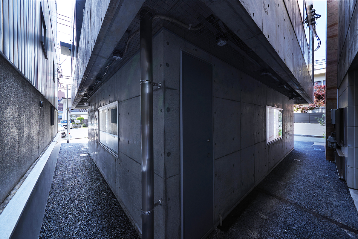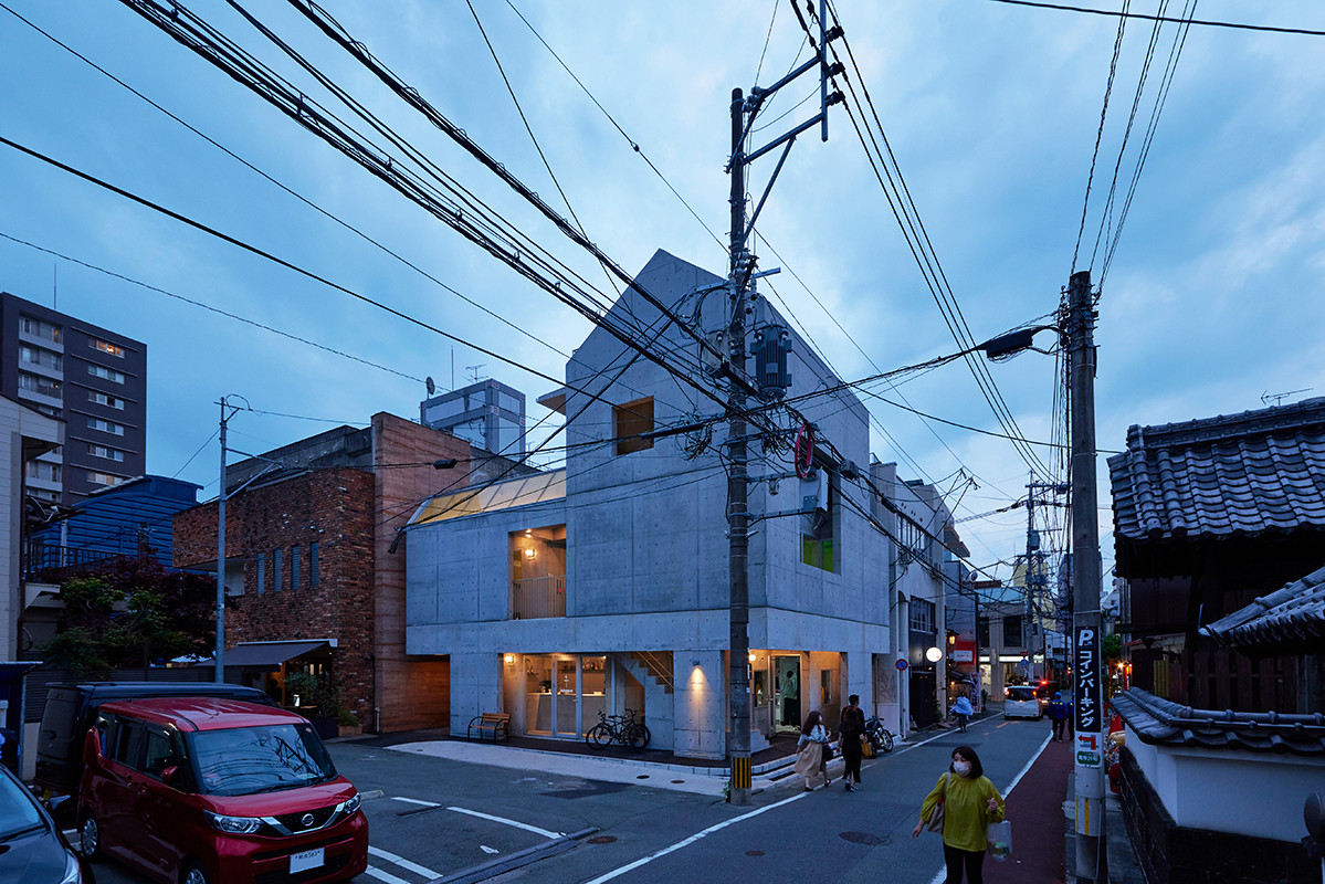 熊本市の中心市街地である上乃裏通りに新築した3階建てのテナントビルです。 古い低層木造建築の活用により栄えた上乃裏通りのスケール感やイメージを踏襲しました。 上乃裏通りの「通り」が建物の上階まで続いていく立体路地により3階までの全てのお店が路面店のような建物を目指しました。 1階は建物の周り全てが路地に面する庇下のようなスペースをつくりました。